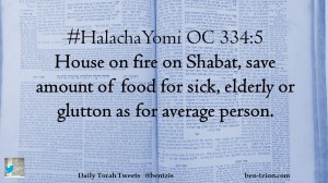 HalachaYomi Date: July 16, 2018Author: bentzis #HalachaYomi OC 334:5 House on fire on Shabat, save amount of food for sick, elderly or glutton as for average person. Share this: Share on X (Opens in new window) X Share on Facebook (Opens in new window) Facebook Like Loading... Related