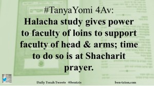 #TanyaYomi 4Av: Halacha study gives power to faculty of loins to support faculty of head & arms; time to do so is at Shacharit prayer.