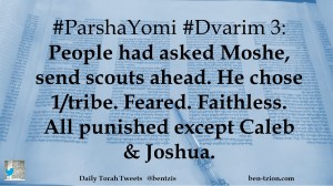 #ParshaYomi #Dvarim 3: People had asked Moshe, send scouts ahead. He chose 1/tribe. Feared. Faithless. All punished except Caleb & Joshua.
