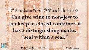 #RambamYomi #Maachalot 13:8 Can give wine to non-Jew to safekeep in closed container, if has 2 distinguishing marks, “seal within a seal.”