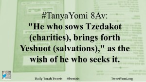 TanyaYomi Date: July 20, 2018Author: bentzis #TanyaYomi 8Av: “He who sows Tzedakot (charities), brings forth Yeshuot (salvations),” as the wish of he who seeks it. Share this: Share on X (Opens in new window) X Share on Facebook (Opens in new window) Facebook Like Loading... Related