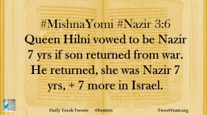 #MishnaYomi #Nazir 3:6 Queen Hilni vowed to be Nazir 7 yrs if son returned from war. He returned, she was Nazir 7 yrs, + 7 more in Israel.