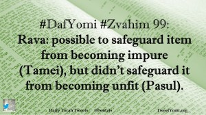 DafYomi, Zvahim Date: July 20, 2018Author: bentzis #DafYomi #Zvahim 99: Rava: possible to safeguard item from becoming impure (Tamei), but didn’t safeguard it from becoming unfit (Pasul). Share this: Share on X (Opens in new window) X Share on Facebook (Opens in new window) Facebook Like Loading... Related