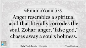 #EmunaYomi 539: Anger resembles a spiritual acid that literally corrodes the soul. Zohar: anger, “false god,” chases away a soul’s holiness.