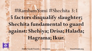 #RambamYomi #Shechita 3:1 5 factors disqualify slaughter; Shechita fundamental to guard against: Shehiya; Drisa; Halada; Hagrama; Ikur.