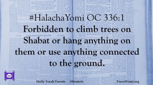 HalachaYomi Date: July 26, 2018Author: bentzis #HalachaYomi OC 336:1 Forbidden to climb tries on Shabat or hang anything on them or use anything connected to the ground. Share this: Share on X (Opens in new window) X Share on Facebook (Opens in new window) Facebook Like Loading... Related
