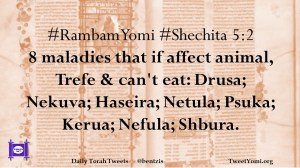 #RambamYomi #Shechita 5:2 8 maladies that if affect animal, Trefe & can’t eat: Drusa; Nekuva; Haseira; Netula; Psuka; Kerua; Nefula; Shbura.