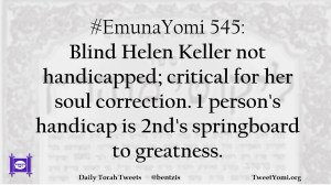 #EmunaYomi 545: Blind Helen Keller not handicapped; critical for her soul correction. 1 person’s handicap is 2nd’s springboard to greatness.
