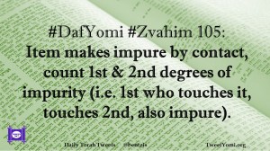 DafYomi, Zvahim Date: July 27, 2018Author: bentzis #DafYomi #Zvahim 105: Item makes impure by contact, count 1st & 2nd degrees of impurity (i.e. 1st who touches it, touches 2nd, also impure). Share this: Share on X (Opens in new window) X Share on Facebook (Opens in new window) Facebook Like Loading... Related