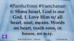 #ParshaYomi #Vaetchanan 6: Shma Israel, God is our God, 1. Love Him w/ all heart, soul, means. Words on heart, teach sons, in house, on way.