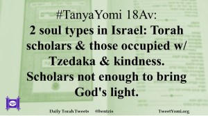 #TanyaYomi 18Av: 2 soul types in Israel: Torah scholars & those occupied w/ Tzedaka & kindness. Scholars not enough to bring God’s light.