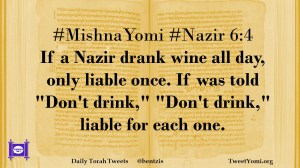 #MishnaYomi #Nazir 6:4 If a Nazir drank wine all day, only liable once. If was told “Don’t drink,” “Don’t drink,” liable for each one.