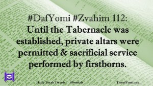 DafYomi, Zvahim #DafYomi #Zvahim 112 Date: August 3, 2018Author: bentzis #DafYomi #Zvahim 112: Until the Tabernacle was established, private altars were permitted & sacrificial service performed by firstborns. Share this: Share on X (Opens in new window) X Share on Facebook (Opens in new window) Facebook Like Loading... Related