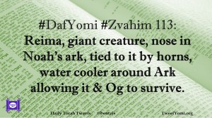 DafYomi, Zvahim #DafYomi #Zvahim 113 Date: August 3, 2018Author: bentzis #DafYomi #Zvahim 113: Reima, giant creature, nose in Noah’s ark, tied to it by horns, water cooler around Ark allowing it & Og to survive. Share this: Share on X (Opens in new window) X Share on Facebook (Opens in new window) Facebook Like Loading... Related