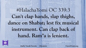 #HalachaYomi OC 339:3 Can’t clap hands, slap thighs, dance on Shabat; lest fix musical instrument. Can clap back of hand. Ram”a is lenient.