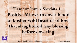 #RambamYomi #Shechita 14:1 Positive Mitzva to cover blood of kosher wild beast or of fowl that slaughtered. Say blessing before covering.