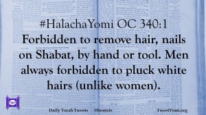 #HalachaYomi OC 340:1 Forbidden to remove hair, nails on Shabat, by hand or tool. Men always forbidden to pluck white hairs (unlike women).