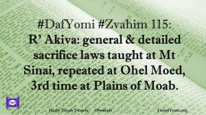 DafYomi, Zvahim #DafYomi #Zvahim 115 Date: August 6, 2018Author: bentzis #DafYomi #Zvahim 115: R’ Akiva: general & detailed sacrifice laws taught at Mt Sinai, repeated at Ohel Moed, 3rd time at Plains of Moab. Share this: Share on X (Opens in new window) X Share on Facebook (Opens in new window) Facebook Like Loading... Related