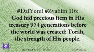 DafYomi, Zvahim #DafYomi #Zvahim 116 Date: August 7, 2018Author: bentzis #DafYomi #Zvahim 116: God hid precious item in His treasury 974 generations before the world was created: Torah, the strength of His people. Share this: Share on X (Opens in new window) X Share on Facebook (Opens in new window) Facebook Like Loading... Related