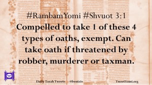 #RambamYomi #Shvuot 3:1 Compelled to take 1 of these 4 types of oaths, exempt. Can take oath if threatened by robber, murderer or taxman.