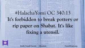 HalachaYomi #HalachaYomi OC 340:13 Date: August 9, 2018Author: bentzis #HalachaYomi OC 340:13 It’s forbidden to break pottery or rip paper on Shabat. It’s like fixing a utensil. Share this: Share on X (Opens in new window) X Share on Facebook (Opens in new window) Facebook Like Loading... Related