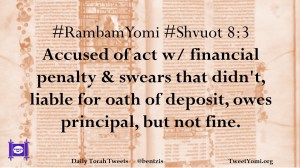 #RambamYomi #Shvuot 8:3 Accused of act w/ financial penalty & swears that didn’t, liable for oath of deposit, owes principal, but not fine.