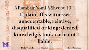 #RambamYomi #Shvuot 10:1 If plaintiff’s witnesses unacceptable, relative, disqualified or king: denied knowledge, took oath: not liable.