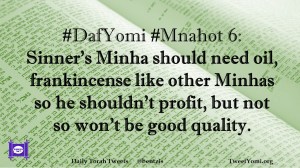 DafYomi, Mnahot #DafYomi #Mnahot 6 Date: August 16, 2018Author: bentzis #DafYomi #Mnahot 6: Sinner’s Minha should need oil, frankincense like other Minhas so he shouldn’t profit, but not so won’t be good quality. Share this: Share on X (Opens in new window) X Share on Facebook (Opens in new window) Facebook Like Loading... Related