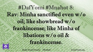 DafYomi, Mnahot #DafYomi #Mnahot 8 Date: August 17, 2018Author: bentzis #DafYomi #Mnahot 8: Rav: Minha sanctified even w/o oil; like showbread w/o frankincense; like Minha of libations w/o oil & frankincense. Share this: Share on X (Opens in new window) X Share on Facebook (Opens in new window) Facebook Like Loading... Related