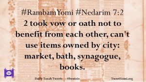 #RambamYomi #Nedarim 7:2 2 took vow or oath not to benefit from each other, can’t use items owned by city: market, bath, synagogue, books.