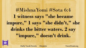 #MishnaYomi #Sota 6:4 1 witness says “she became impure,” 1 says “she didn’t,” she drinks the bitter waters. 2 say “impure,” doesn’t drink.