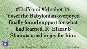 DafYomi, Mnahot #DafYomi #Mnahot 18 Date: August 28, 2018Author: bentzis #DafYomi #Mnahot 18: Yosef the Babylonian overjoyed finally found support for what had learned. R’ Elazar b Shamua cried in joy for him. Share this: Share on X (Opens in new window) X Share on Facebook (Opens in new window) Facebook Like Loading... Related
