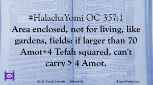 #HalachaYomi OC 357:1 Area enclosed, not for living, like gardens, fields: if larger than 70 Amot+4 Tefah squared, can’t carry > 4 Amot.