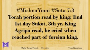 #MishnaYomi #Sota 7:8 Torah portion read by king: End 1st day Sukot, 8th yr. King Agripa read, he cried when reached part of foreign king.
