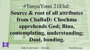 #TanyaYomi 21Elul: Source & root of all attributes from ChaBaD: Chochma apprehends God; Bina, contemplating, understanding; Daat, bonding.
