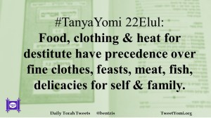 #TanyaYomi 22Elul: Food, clothing & heat for destitute have precedence over fine clothes, feasts, meat, fish, delicacies for self & family.