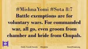 #MishnaYomi #Sota 8:7 Battle exemptions are for voluntary wars. For commanded war, all go, even groom from chamber and bride from Chupah.
