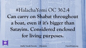 #HalachaYomi OC 362:4 Can carry on Shabat throughout a boat, even if it’s bigger than Satayim. Considered enclosed for living purposes.