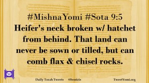 #MishnaYomi #Sota 9:5 Heifer’s neck broken w/ hatchet from behind. That land can never be sown or tilled, but can comb flax & chisel rocks.