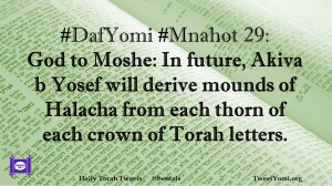 DafYomi, Mnahot #DafYomi #Mnahot 29 Date: September 7, 2018Author: bentzis #DafYomi #Mnahot 29: God to Moshe: In future, Akiva b Yosef will derive mounds of Halacha from each thorn of each crown of Torah letters. Share this: Share on X (Opens in new window) X Share on Facebook (Opens in new window) Facebook Like Loading... Related