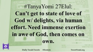 #TanyaYomi 27Elul: Can’t get to state of love of God w/ delights, via human effort. Need immense exertion in awe of God, then comes on own.