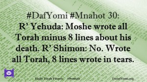 DafYomi, Mnahot #DafYomi #Mnahot 30 Date: September 8, 2018Author: bentzis #DafYomi #Mnahot 30: R’ Yehuda: Moshe wrote all Torah minus 8 lines about his death. R’ Shimon: No. Wrote all Torah, 8 lines wrote in tears. Share this: Share on X (Opens in new window) X Share on Facebook (Opens in new window) Facebook Like Loading... Related