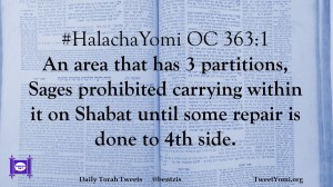 #HalachaYomi OC 363:1 An area that has 3 partitions, Sages prohibited carrying within it on Shabat until some repair is done to 4th side.