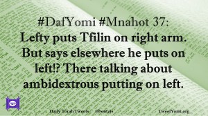 DafYomi, Mnahot #DafYomi #Mnahot 37 Date: September 16, 2018Author: bentzis #DafYomi #Mnahot 37: Lefty puts Tfilin on right arm. But says elsewhere he puts on left!? There talking about ambidextrous putting on left. Share this: Share on X (Opens in new window) X Share on Facebook (Opens in new window) Facebook Like Loading... Related