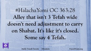 #HalachaYomi OC 363:28 Alley that isn’t 3 Tefah wide doesn’t need adjustment to carry on Shabat. It’s like it’s closed. Some say 4 Tefah.
