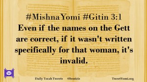 #MishnaYomi #Gitin 3:1 Even if the names on the Gett are correct, if it wasn’t written specifically for that woman, it’s invalid.