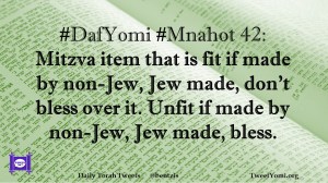 DafYomi, Mnahot #DafYomi #Mnahot 42 Date: September 21, 2018Author: bentzis #DafYomi #Mnahot 42: Mitzva item that is fit if made by non-Jew, Jew made, don’t bless over it. Unfit if made by non-Jew, Jew made, bless. Share this: Share on X (Opens in new window) X Share on Facebook (Opens in new window) Facebook Like Loading... Related