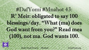DafYomi, Mnahot #DafYomi #Mnahot 43 Date: September 21, 2018Author: bentzis #DafYomi #Mnahot 43: R’ Meir: obligated to say 100 blessings/day. “What (ma) does God want from you?” Read mea (100), not ma. God wants 100. Share this: Share on X (Opens in new window) X Share on Facebook (Opens in new window) Facebook Like Loading... Related