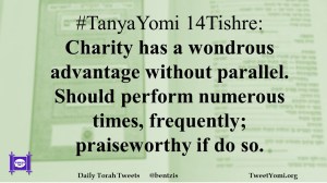 #TanyaYomi 14Tishre: Charity has a wondrous advantage without parallel. Should perform numerous times, frequently; praiseworthy if do so.