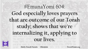 #EmunaYomi 604: God especially loves prayers that are outcome of our Torah study; shows that we’re internalizing it, applying to our lives.